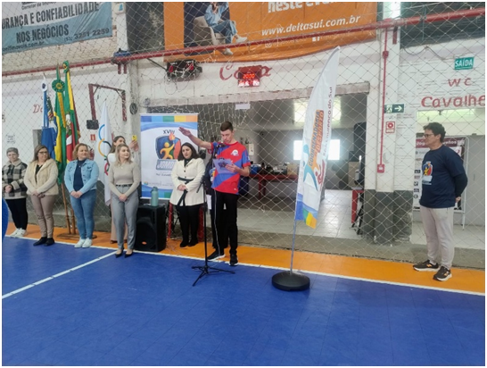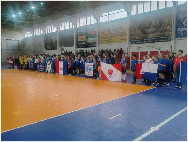 As competições começaram hoje no ginásio do Esporte Clube São Lourenço com a modalidade de handebol em disputa. Abaixo estudantes representando suas escolas na solenidade.