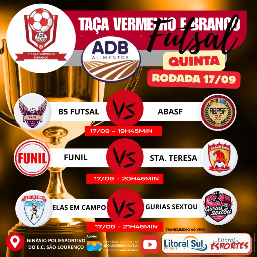 Na noite de quarta feira 17 de setembro no ginásio de esportes do Esporte Clube São Lourenço segue a Taça Vermelho e Branco ADB Alimentos com a disputa de sua quinta rodada. Com o primeiro e o segundo jogos de equipes masculino, e uma estreia no feminino no jogo de fundo. Abaixo a rodada, que inicia as 19h45 com os seguintes jogos, arte de autoria de Luís Felipe Lobato: