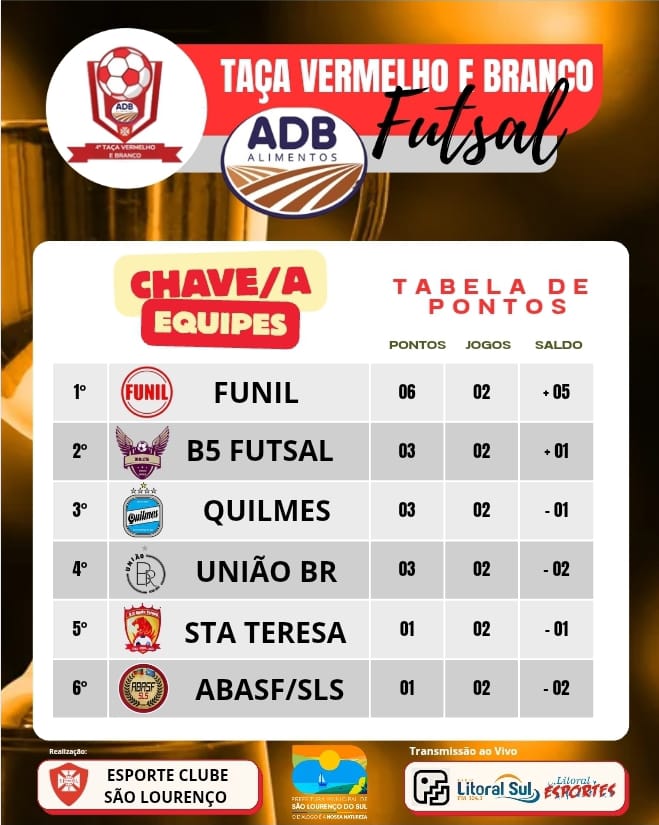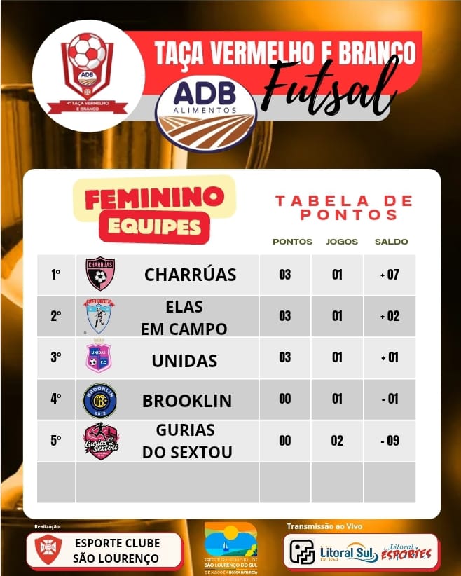 Ontem, dia 17 de setembro, quarta feira aconteceu a 5ª rodada da Taça Vermelho e Branco ADB Alimentos – edição 2025 no ginásio de esportes do Esporte Clube São Lourenço. Os resultados: