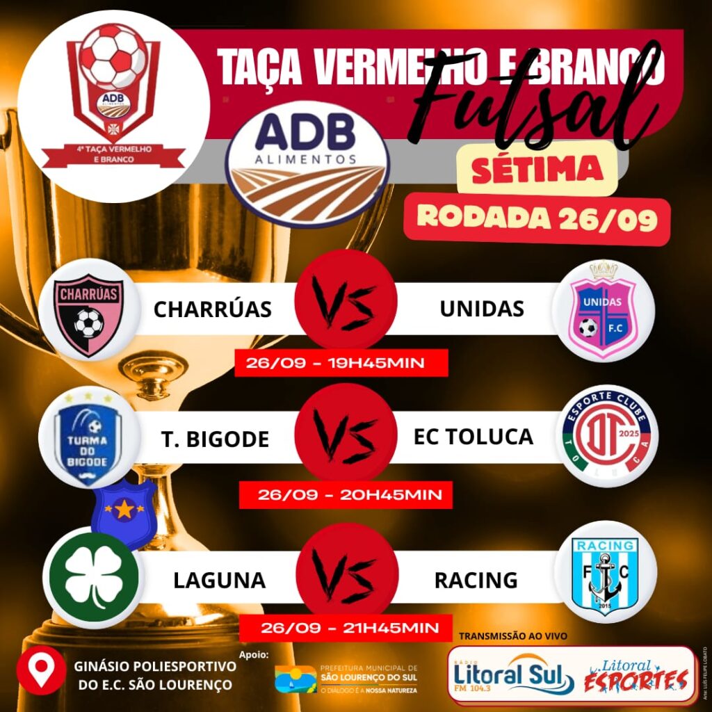A Taça Vermelho e Branco ADB Alimentos teve modificada a data de sua 7ª rodada. Por motivos operacionais ao invés do dia 25 de setembro quinta feira, a rodada acontecerá amanhã dia 26 de setembro sexta feira. Hoje tem a estreia da seleção de São Lourenço do Sul na competição da CCDF em Capão do Leão, o que também poderia ser um fator para afastar a torcida do ginásio do Esporte Clube São Lourenço. Assim o clube, com seu diretor de esportes Jones Heller e de comum acordo com as equipes participantes da rodada resolveram transferir a rodada. Abaixo, arte de Luís Felipe Lobato, a rodada: