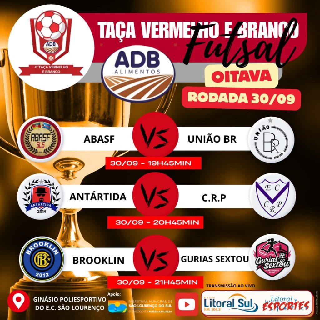 Hoje, terça feira último dia de setembro no ginásio de esportes do Esporte Clube São Lourenço, acontece a 8ª rodada da Taça Vermelho e Branco ADB Alimentos, edição 2025. Os jogos que iniciam as 19h45 tem os seguintes confrontos, em arte elaborada por Luís Felipe Lobato: