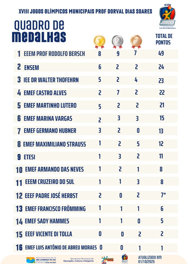 Para finalizar uma atualização no quadro de medalhas dos XVIII JOMDDS: