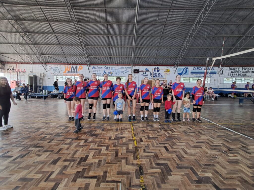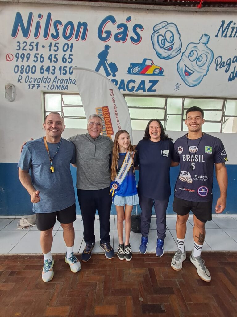 Além disso registrar a presença das crianças da Escola Municipal de Ensino Infantil Raio de Sol na competição em uma imagem com atletas da Escola Estadual de Ensino Médio Rodolfo Bersch.
