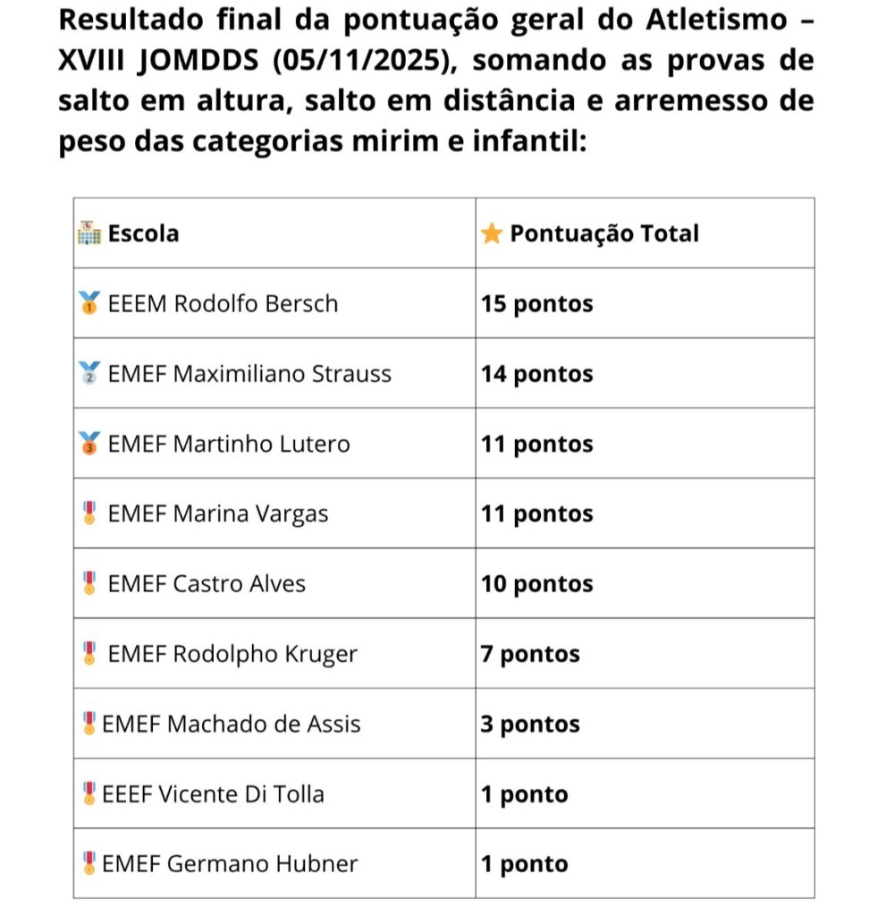 Amanhã, quinta feira dia 6 de novembro estão previstas as mesmas modalidades no mesmo local: Lançamento de peso, salto à distância e salto em altura, mas nas categorias juvenil e sub-20 masculino e feminino. Na tabela abaixo, a pontuação geral do Atletismo, somados os pontos de arremesso de peso, salto em distância e salto em altura conforme trabalho elaborado pela organização, lembrando que o quadro de medalhas ainda não foi atualizado;