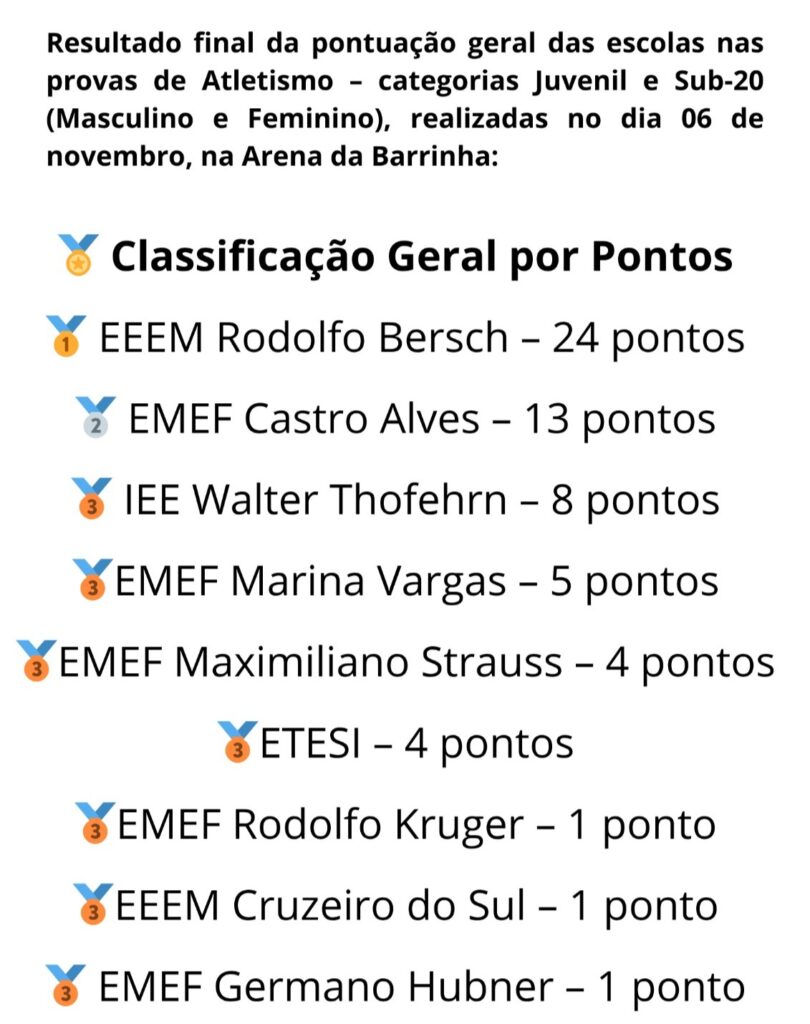 Foi uma manhã com as disputas nas categorias juvenil e sub-20 nas modalidades já mencionadas acima. O esforço dos e das atletas demonstrou preparo, disciplina e a superação pessoal, e a recompensa ao atingir os objetivos de cada disputa. Com o legado de cada atleta que deixou sua marca pessoal na competição. Os resultados do último dia dos JOMDDS na Arena da Barrinha, com os pontos conquistados pelas escolas participantes, conforme tabela da organização da competição: