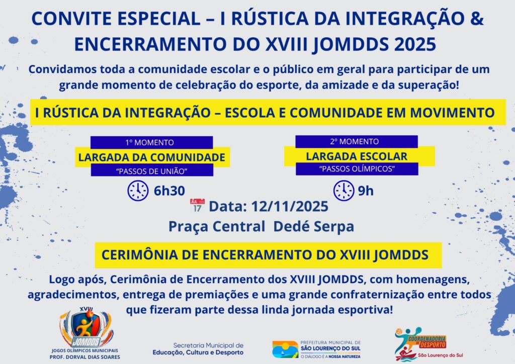 Mas quarta feira dia 12, será dia da rústica da Integração em sua primeira e inédita edição. Integração porque em um primeiro momento de largada, ela será da comunidade, com horário marcado bem cedo, para as 6 h 30. E as 9 h a prova será dos estudantes fechando assim as competições. Tudo isso na Praça central, a praça Dedê Serpa. E no final a grande cerimônia de encerramento, com homenagens, agradecimentos, entrega de premiações e uma grande confraternização entre os protagonistas dessa competição inesquecível.