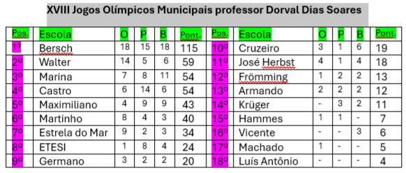 Para finalizar o quadro de medalhas atualizado com as escolas participantes, trabalho elaborado em consonância com a organização dos XVIII Jogos Olímpicos Municipais professor Dorval Dias Soares.