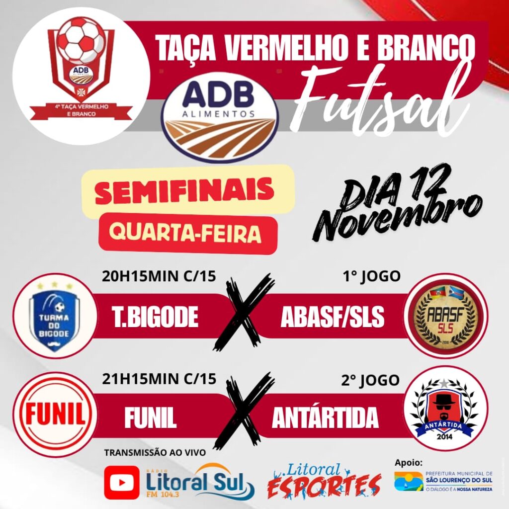 As semifinais da categoria livre da Taça Vermelho e Branco ADB Alimentos edição 2025 tiveram sua data de disputas definida pela organização da competição. As partidas acontecem amanhã quarta feira dia 12 de novembro no ginásio poliesportivo Ernani Mendes, Mecha a partir das 20h15 com 15 minutos de tolerância. Veja a programação conforme a arte de Luís Felipe Lobato: