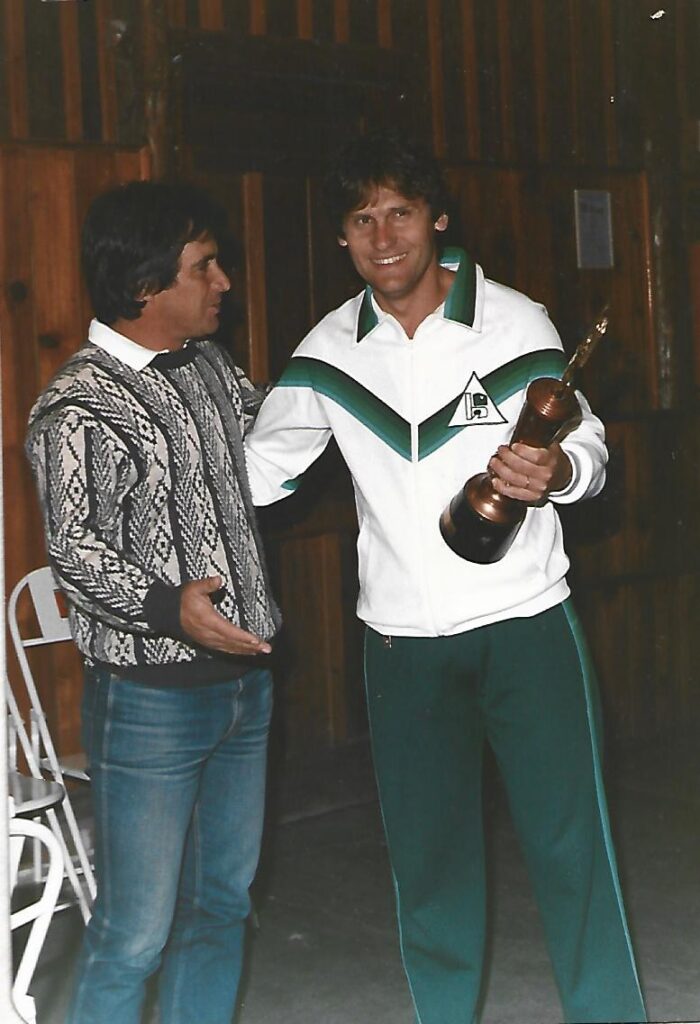 Carlos Alberto recebendo premiação de goleiro menos vazado, imagem de Carlos Alberto Venzke de Freitas, nas mãos do professor Adamires Pedruzzi então fazendo parte da diretoria do Grêmio Esportivo Lourenciano: