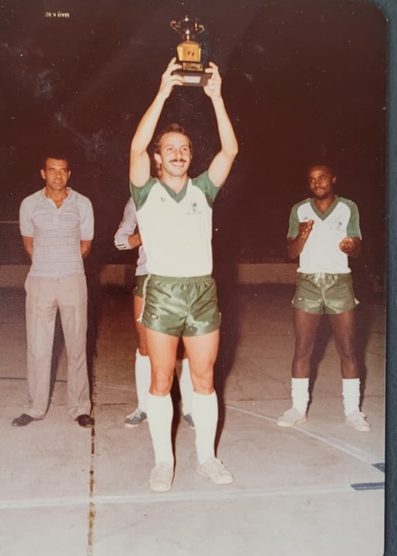 A seguir, imagens da premiação de atletas da Gráfica Hofstätter, Chico Scatollin com troféu pela conquista do campeonato, ao fundo o treinador Gabriel o Major e o atleta Nandinho. Chico lembra que nos anos 1970 foi um período onde muitas equipes participantes surgiam quando alguém se encarregava de juntar uma turma e participar de um campeonato. E a realidade de hoje é diferente com equipes buscando reforços fora de São Lourenço do Sul.