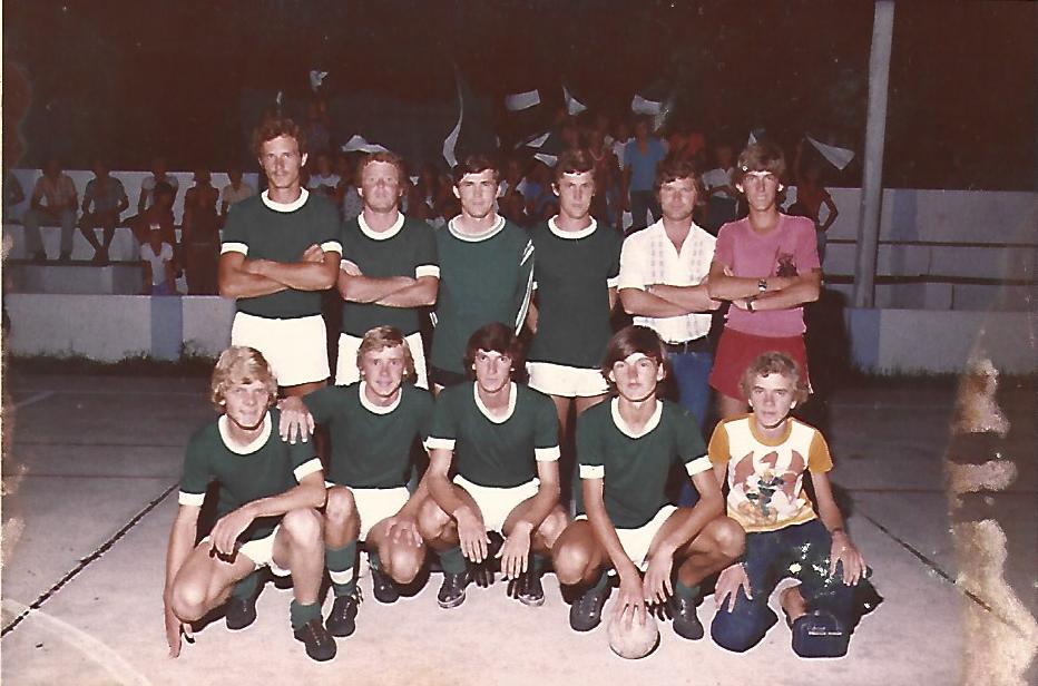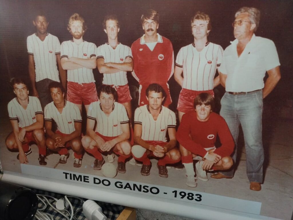 Hoje, como parte II queremos trazer um pouco de um confronto de duas equipes que nunca conseguiram chegar a conquista de um título. Equipes que marcaram o final dos anos 1970 e a primeira metade dos anos 1980: JESLO e Ganso. O Ganso era uma equipe formada por um grupo de amigos, que ainda hoje se encontram para confraternização e lembrança dos tempos de atletas. A rigor, a equipe do Ganso nunca ganhou um título. Aliás, sequer chegou a disputar uma final no Grêmio Esportivo Lourenciano. Mas era participante certo na competição. Abaixo, imagem, créditos para Paulo Ricardo de Quevedo, o Puinho, a equipe do Ganso no campeonato do ano de 1983. A identificação, da esquerda para direita em pé: Puinho, Ênio Gehrke, Gustavo, Leal, Valnir e o treinador Raul Schuch. Agachados: Nico Soares, Nato, Tonha Lessa, Antônio e Davi Diesel.