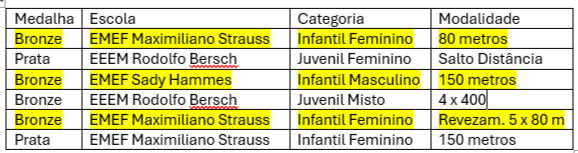 Abaixo o quadro de medalhas conquistadas pelos escolares lourencianos nas diversas categorias e modalidades. As escolas que estiveram representando São Lourenço do Sul foram: Escola Municipal de Ensino Fundamental Martinho Lutero, Escola Municipal de Ensino Fundamental Sady Hammes, Escola Municipal de Ensino Fundamental Maximiliano Strauss e Escola Estadual de Ensino Médio Rodolfo Bersch.