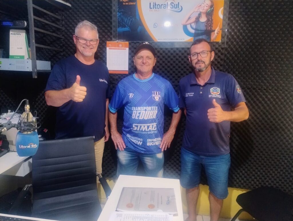 Estiveram presentes no programa o comandante técnico da equipe, Fábio Rosito e o dirigente e também atleta da equipe Jainísio Blödorn, em uma resenha legal falando um pouco das conquistas da equipe, em especial categoria veteranos. E claro, sobre a competição recém finalizada, a Taça SLS 2025 de futebol de campo, onde a equipe da Harmonia conquistou o título após uma vitória incontestável contra o Esporte Clube Rosário por 3 x 0 na final. Abaixo Fábio Rosito, Jainísio Blödorn e o apresentador do programa Renato Brächer.