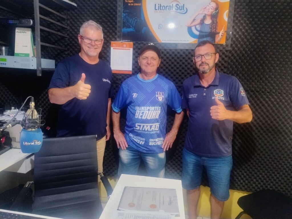 Estiveram presentes no programa o comandante técnico da equipe, Fábio Rosito e o dirigente e também atleta da equipe Jainísio Blödorn, em uma resenha legal falando um pouco das conquistas da equipe, em especial categoria veteranos. E claro, sobre a competição recém finalizada, a Taça SLS 2025 de futebol de campo, onde a equipe da Harmonia conquistou o título após uma vitória incontestável contra o Esporte Clube Rosário por 3 x 0 na final. Abaixo Fábio Rosito, Jainísio Blödorn e o apresentador do programa Renato Brächer.