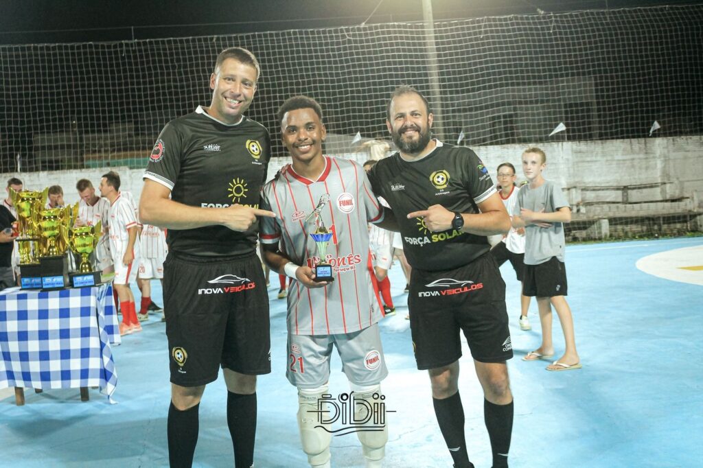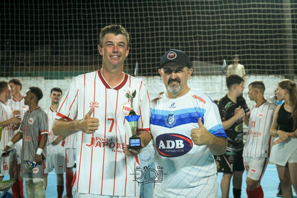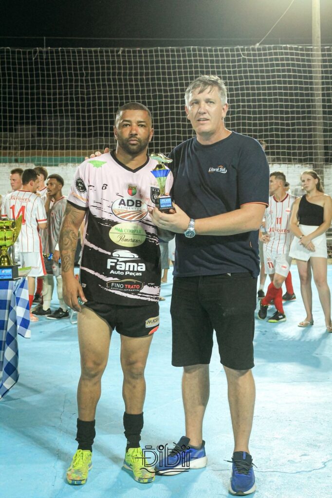 E a outra premiação, de goleador do campeonato foi para o atleta Geyo da equipe da Amplimaq que marcou nove gols. Na imagem o capitão da equipe Amplimaq, Bad recebendo o troféu representando o goleador das mãos de Dênis Peglow diretor da rádio Litoral Sul e Coordenador da equipe de esportes.